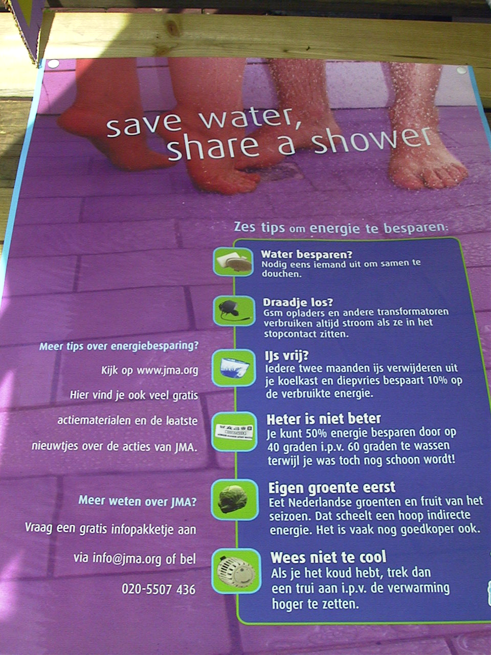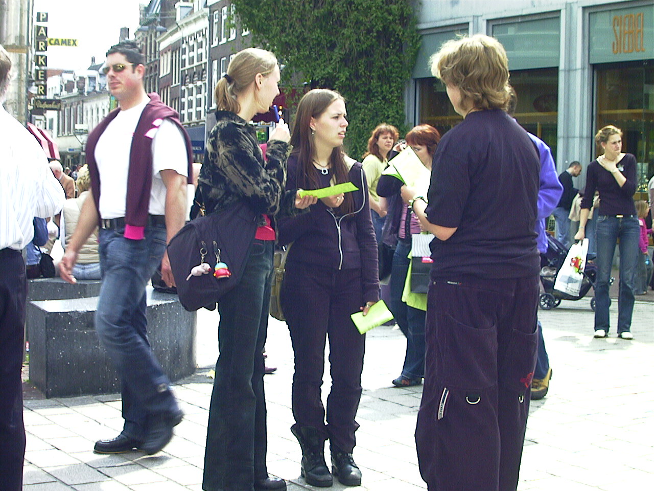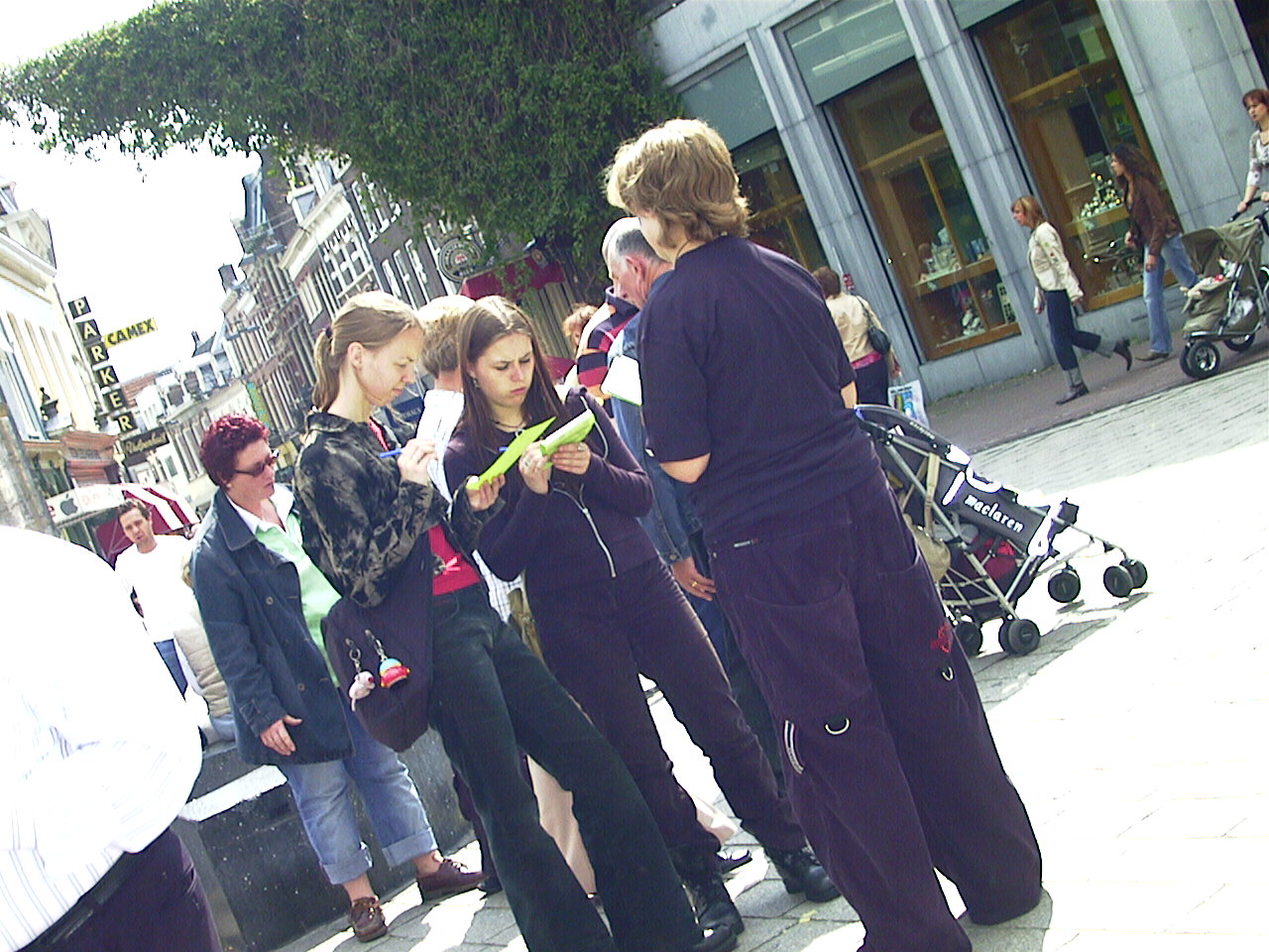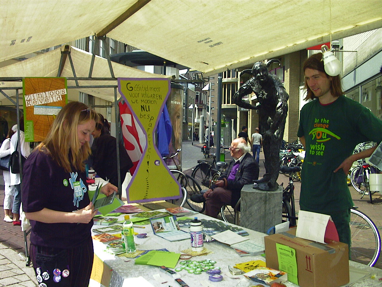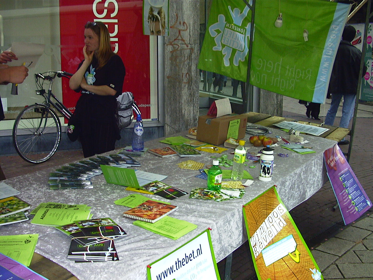 Op 21 mei heeft Jongeren Milieu Actief voor het eerst actie gevoerd in Arnhem. We stonden in de binnenstad met een kraam vol tips voor energiebesparing, gesymboliseerd door voorwerpen, zoals spaarlampen (hangend aan een touwtje), (aard)appels uit eigen land, een fietsbel, een vleesvervangerverpakking, een deurklink (de deuren goed sluiten blijkt veel te schelen!) en een lichtknopje. Intussen spraken we met tal van voorbijgangers over het broeikaseffect en wat zij doen, of zouden willen doen om bij te dragen aan beperking van de CO2-uitstoot. Veertig van hen vulden ook de prijsvraag in over dit onderwerp. De anti-reclamestickers (NEE/JA en NEE/NEE) waren erg in trek, veel mensen hoeven niet zo nodig reclamefolders maar weten niet waar ze zo'n sticker vandaan moeten halen. Een fijn zonnetje droeg bij aan een geslaagde actie, die aantoonde dat veel mensen wel degelijk iets over hebben voor het milieu. |